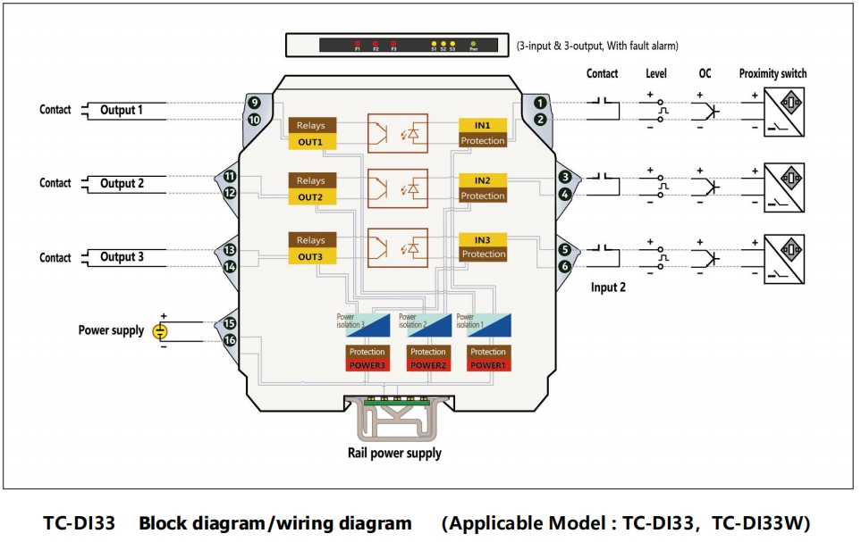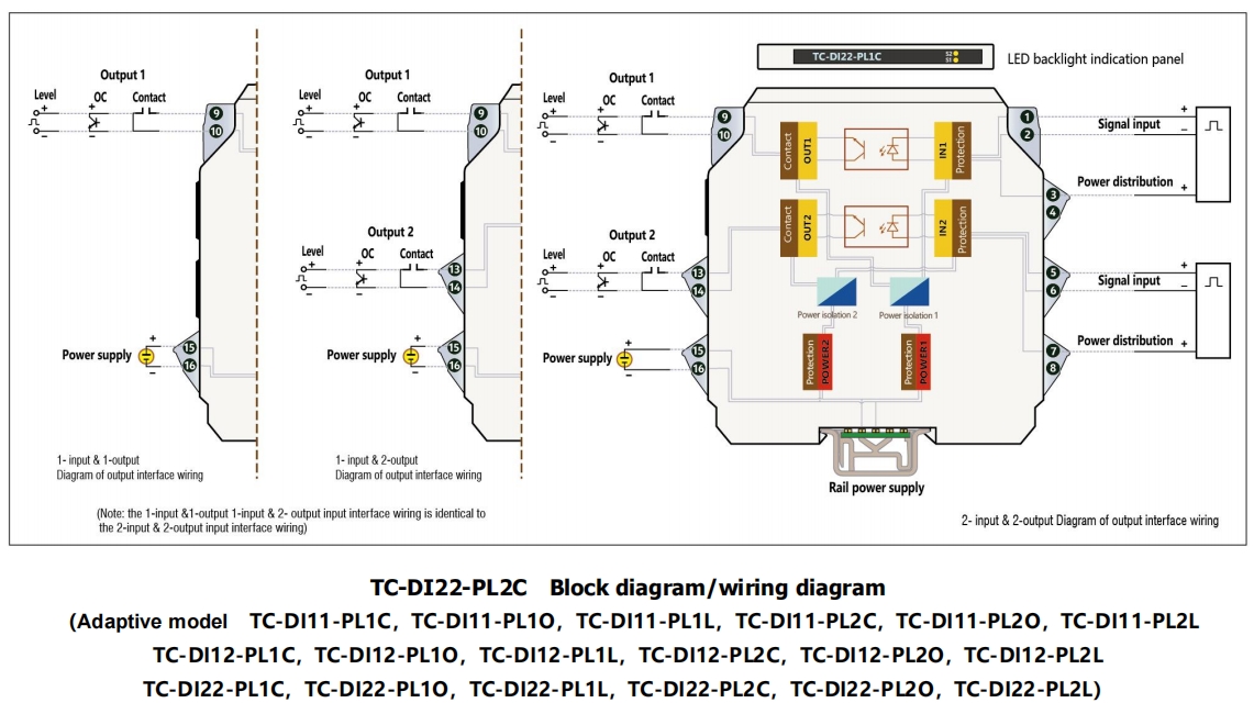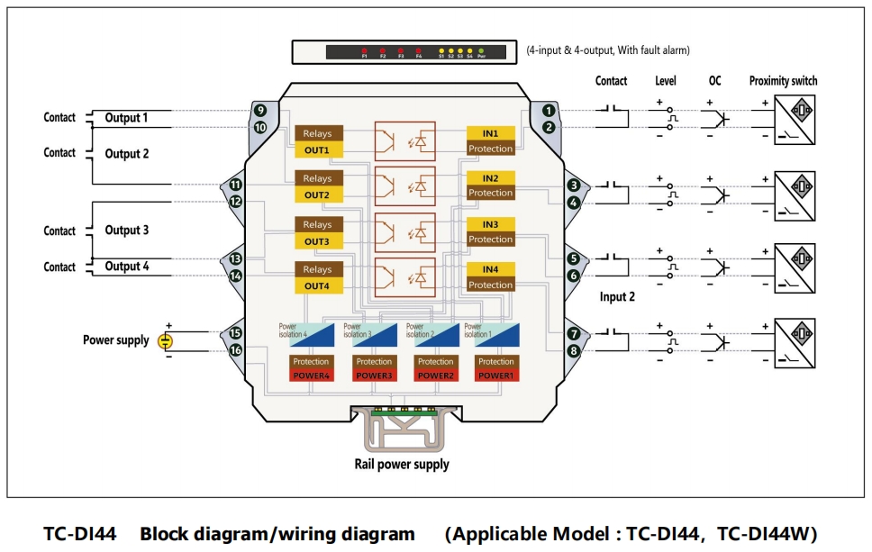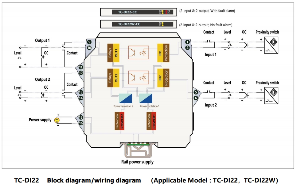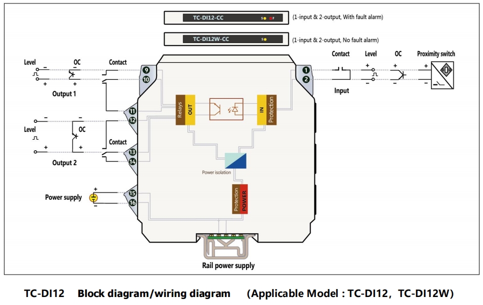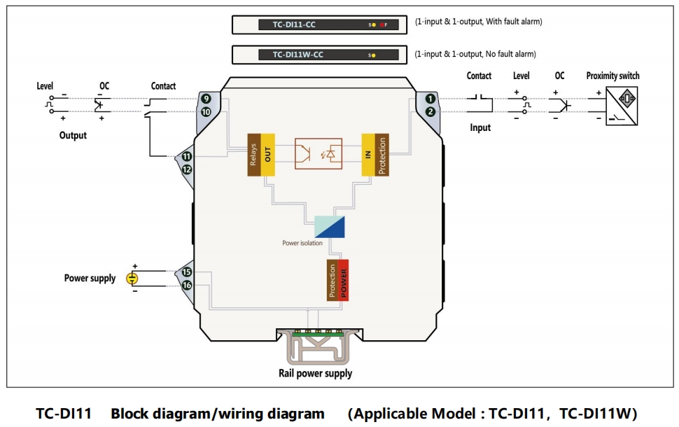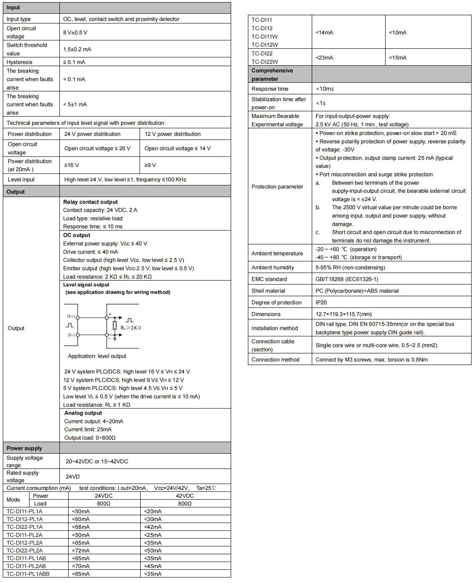TC-DI применяется к входу OC, уровня, контактного переключателя или бесконтактного датчика NAMUR. После изоляции выход осуществляется в виде релейных контактов (или выхода OC и выхода уровня).