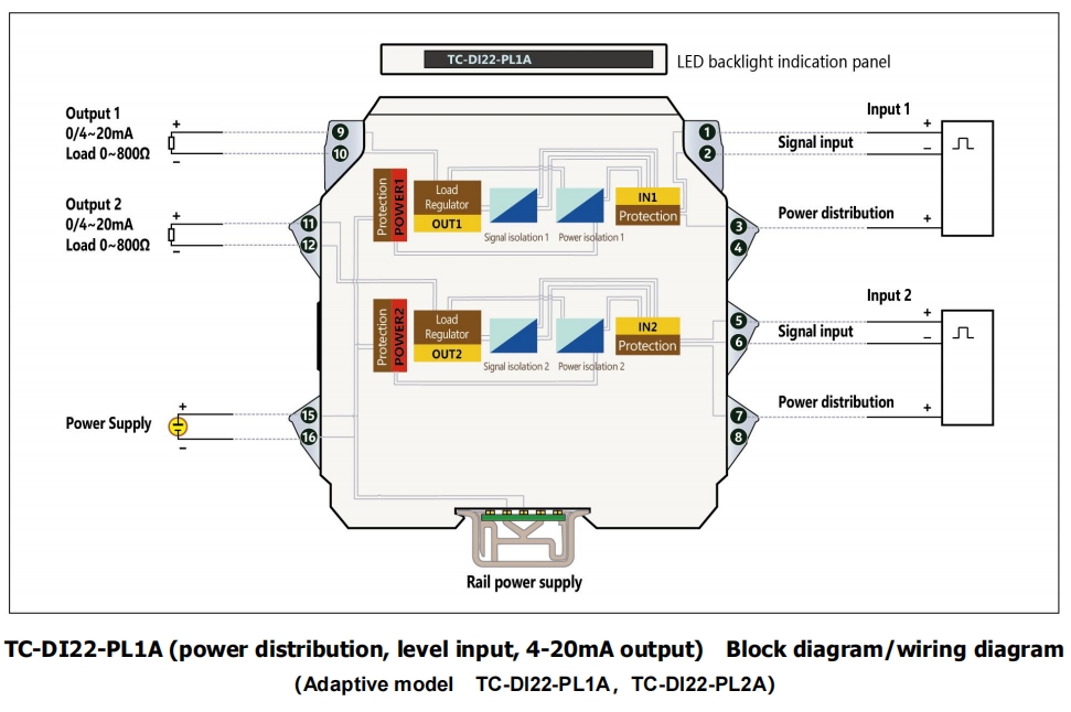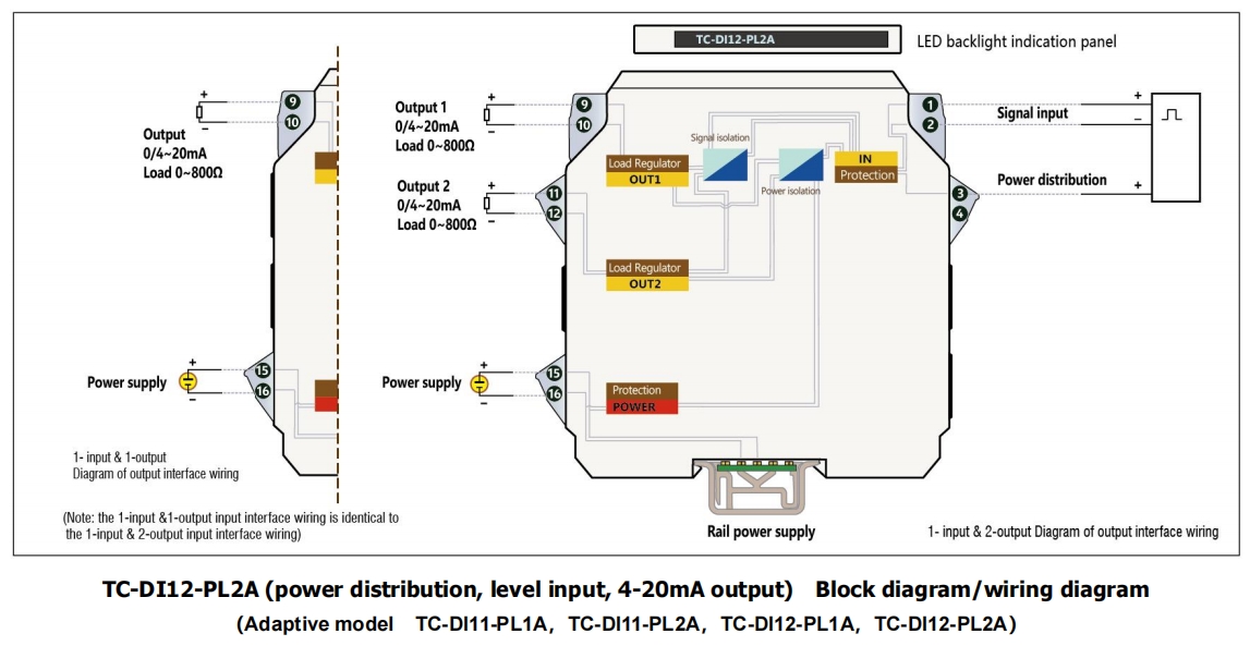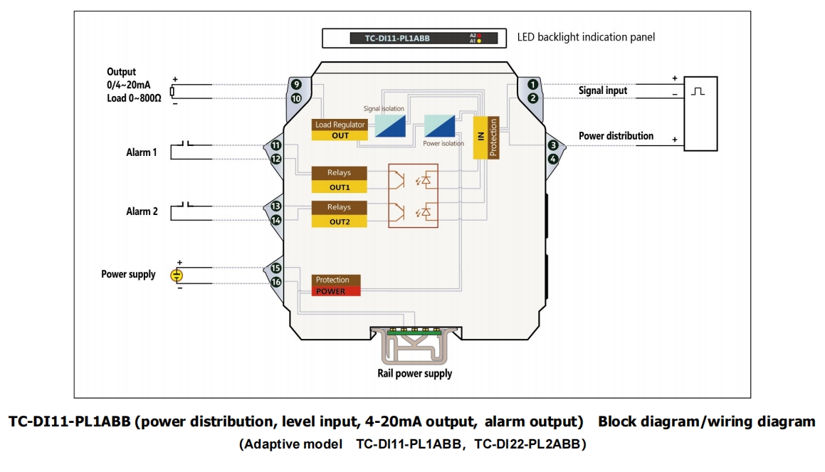 Пример 7. TC-DI11-PL2ABB-V1……1 вход и 1 выход , ( Распределение питания 24 В , Уровневый входной сигнал ,, выход 4~20 мА и два релейных контактных сигнальных выхода,