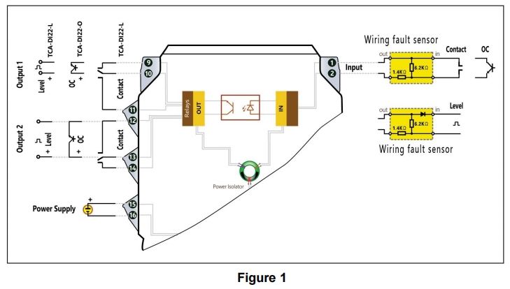 ТК-ДИ применяется к входу OC, уровня, контактного переключателя или бесконтактного датчика NAMUR. После того как