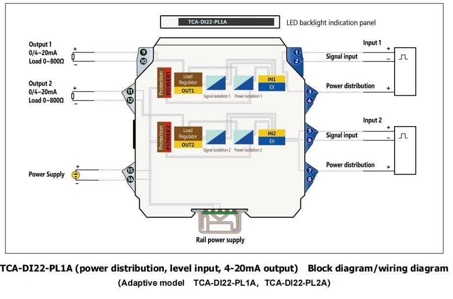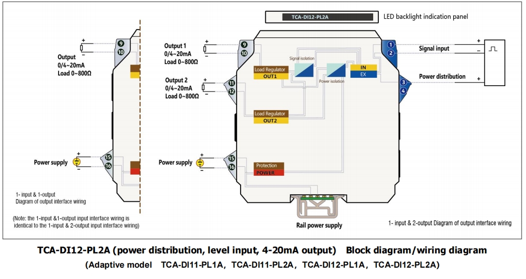 Пример 6. TCA-DI12-PL1A-V1……1 вход и 2 выхода , ( Распределение питания 12 В , Уровневый входной сигнал , и два выхода 4–20 мА, терминальный источник питания 20–42 В пост. тока)
