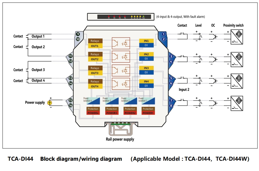 Пример 4. TCA-DI44W-CC-V2……4 входа и 4 выхода , сигнал о неисправности линии ( вход контактного или бесконтактного детектора, а также выходной контакт, питание от направляющей шины 20–42 В пост. тока)
