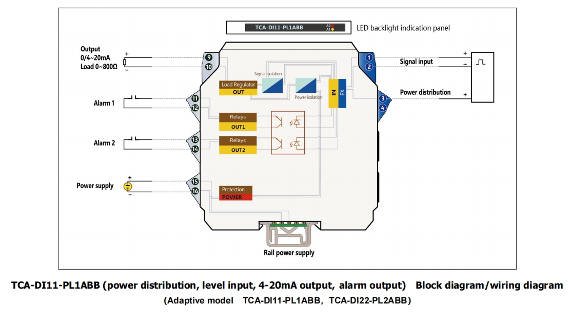 Пример 7. TCA-DI11-PL2ABB-V1……1 вход & 1 выход , ( Распределение питания 24 В , Уровневый входной сигнал ,, выход 4–20 мА и два релейных контактных сигнальных выхода,