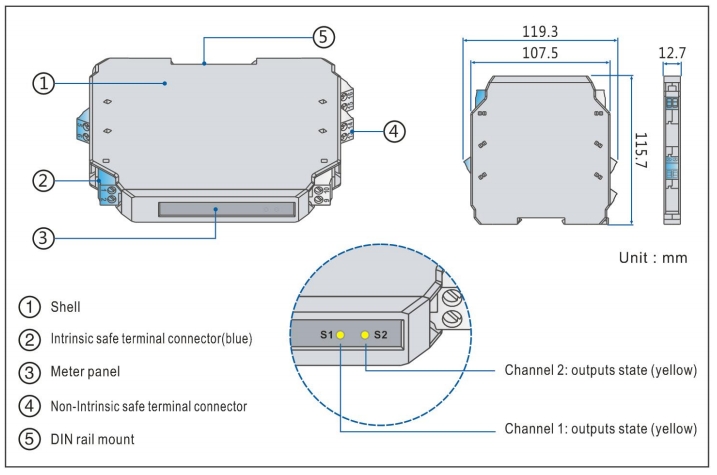 Светодиодные индикаторы: зелёный — индикация питания, жёлтый — состояние выхода, включается, когда цепь вывода